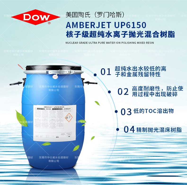 羅門哈斯樹脂Amberjet UP6150 Amberjet UP6150是由完全好的陰陽樹脂組成,應(yīng)用于超純水處理系統(tǒng)中反滲透裝置后的混床中。這種混床樹脂產(chǎn)品一般應(yīng)用于特殊電子行業(yè)的超純水精制中,如生產(chǎn)磁盤驅(qū)動(dòng)器、顯示設(shè)備、CD-ROM、獨(dú)立的半導(dǎo)體設(shè)備、低密集成電路,或者用于后級(jí)集成電路的分塊和配件操作中。這些應(yīng)用即需要有高純度的水質(zhì),又需要具有經(jīng)濟(jì)性。只要超純水系統(tǒng)的設(shè)計(jì)合理,因?yàn)锳mberjet UP6150在精制混床中營運(yùn)出水就能達(dá)到18M.c,且TOC含量小于5ppb。因?yàn)锳mberjet UP6150高水平的特性,它同樣適合于應(yīng)用于其它一些普遍的超純水制造行業(yè)中。 注意事項(xiàng) 羅門哈斯混床樹脂UP6150裝填步驟以及注意事項(xiàng): 1. 拋光樹脂是由氫型強(qiáng)酸性陽離子交換樹脂及氫氧型強(qiáng)鹼性陰離子交換樹脂混合而成。 2.在作業(yè)中,如需加入水以方便裝填,請(qǐng)注意必須使用純水,水份不得太多,同時(shí)必須在樹脂進(jìn)入樹脂槽后立即將水抽出或排掉,避免樹脂的分層。 3.如需用手裝填樹脂,請(qǐng)務(wù)必將手洗凈,切勿將油脂帶入樹脂槽內(nèi)。 4.如為換裝樹脂,必須完全的清洗桶槽及集水器,不得有老舊樹脂殘留槽底,否則這些使用過的樹脂將會(huì)污染水質(zhì)。 5.所使用的O型圈緊迫,必須定時(shí)更換。同時(shí)每次換裝時(shí)必須檢查相關(guān)的零組件,如有破損,必須立即更換。檢查集水器,如有堵塞,應(yīng)該清除。 6.使用FRP桶槽當(dāng)作樹脂床,應(yīng)先將集水管留置于桶槽中再裝填樹脂。在裝填樹脂的過程中,應(yīng)不定時(shí)的搖晃集水管,如此在較后,才能調(diào)整集水管的位置并安裝上蓋。 7.如先裝填樹脂,則在插入集水管將會(huì)遇到困難。如一定要必須先裝填樹脂才能插入集水管,則可將已裝滿樹脂的FRP槽橫置于地上,緩慢的滾動(dòng)桶槽以松動(dòng)樹脂,再慢慢的將集水管插入樹脂中。 8.樹脂裝填完并接上管線后,應(yīng)先將桶槽上端的通氣孔打開,緩慢的通入水,直至通氣孔溢水且不再有氣泡產(chǎn)生后,將通氣孔緊閉,開始采水。 為達(dá)到效果建議的營運(yùn)條件