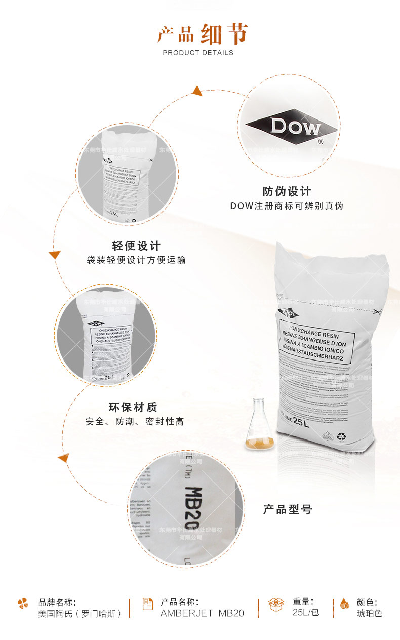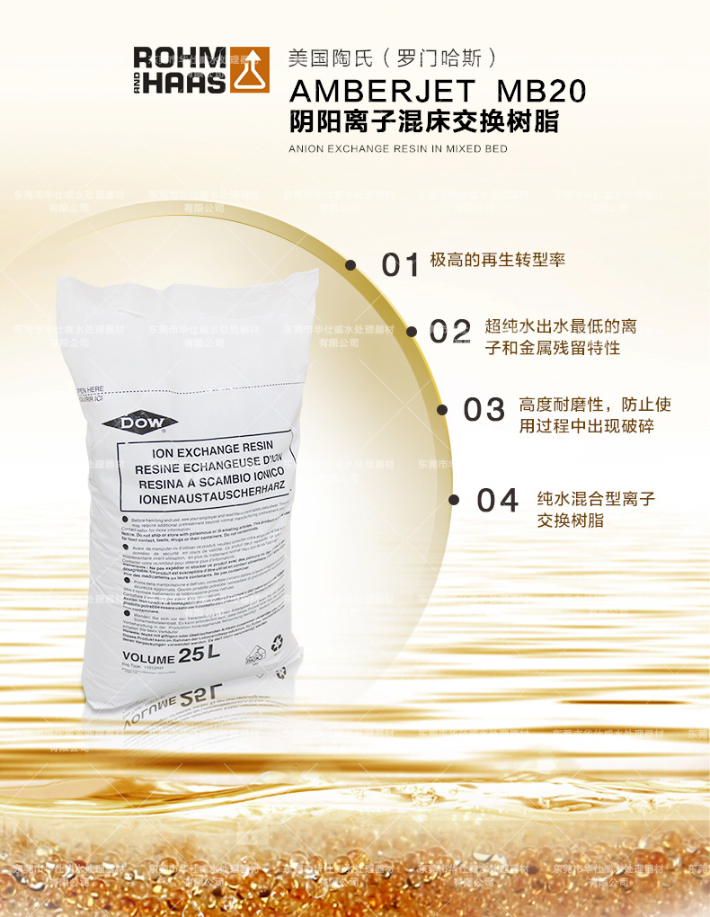 羅門哈斯混床樹脂MB20是一種經離子均衡化后的混床樹脂,它是由強陽離子交換樹脂與強陰離子交換樹脂混合而成,可直接使用于製程。羅門哈斯混床樹脂被用來生產超純水,它可適用于需要二氧化硅含量低、無二氧化碳的除礦水處理。