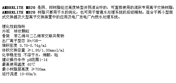 AMBERLITE MB20是一種經離子均衡化后的混床樹脂。它是由強陽離子交換樹脂與強陰離子交換樹脂混合而成,可直接使用于制程。AMBERLITE MB20被用來生產超純水,它可適用于需要二氧化矽含量低、無二氧化碳的除礦水處理。