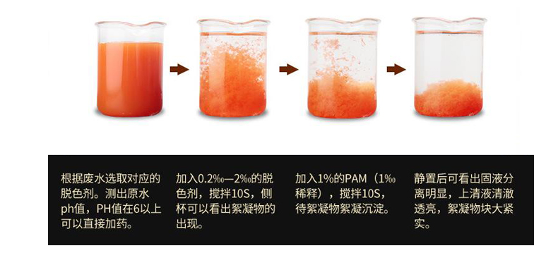 1、用10-40水稀釋本品,然后直接加入水中,攪拌數分鐘后進行沉淀或氣浮,即可得到脫色清液。2、廢水PH值范圍6-12都能有理想效果。3、可以和聚丙烯酰胺搭配使用,但不能混合使用,這樣可以加速沉淀澄清時間。添加量視廢水性質和本身而定。