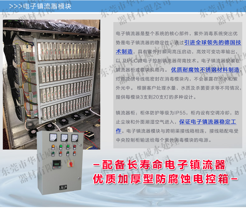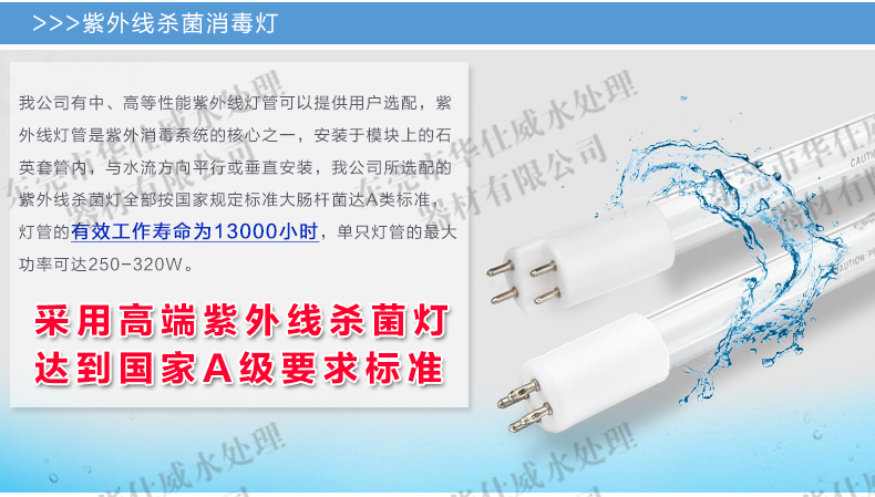 ·電纜部分增設密封圈,有效防止由于電纜線進水造成的燈管短路損壞。·配套西門子PLC及行業高端品牌美國KANADON紫外線燈管,出水水質達到國家一級A類標準。·根據客戶處理水量,水質及殺菌要求等不同情況,提供每模塊3支到20支燈的多種設計。
