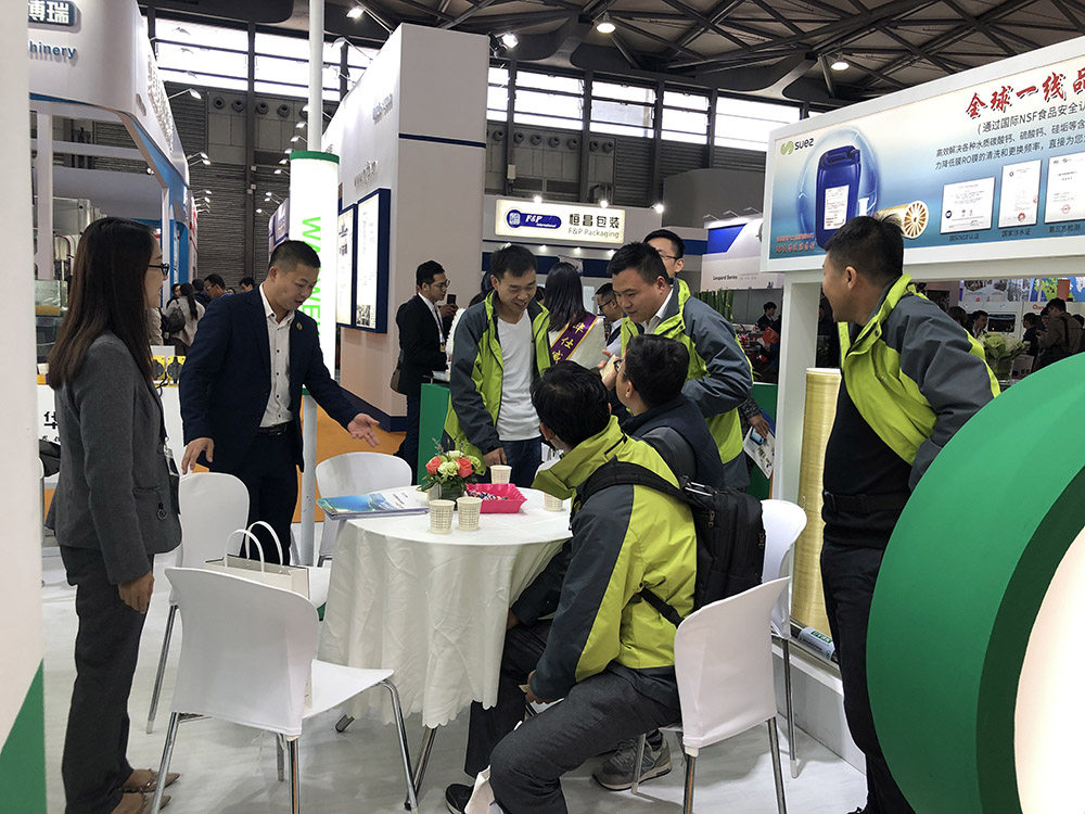 因華仕威所銷售的反滲透膜阻垢劑能有效解決了自來水、井水、山泉水及湖水里面的碳酸鈣、硫酸鈣、硅垢等含量過高導致的結垢問題,大力降低RO膜的清洗和更換頻率,為用戶直接大力節省運營成本,展會現場風起云涌,華仕威展區熱鬧非凡。