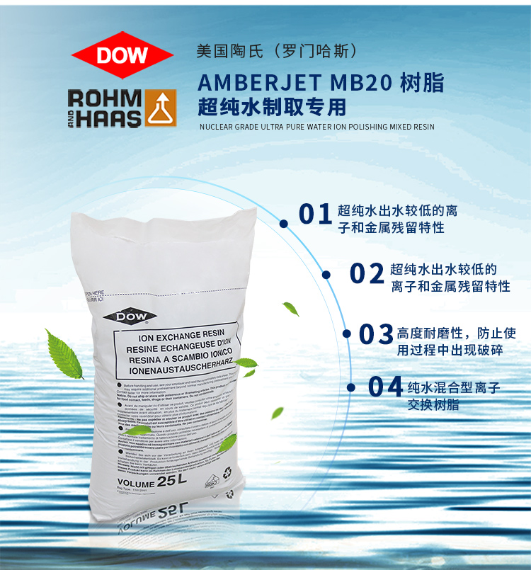 門哈斯混床樹脂MB20是一種經離子均衡化后的混床樹脂,它是由強陽離子交換樹脂與強陰離子交換樹脂混合而成,可直接使用于製程。羅門哈斯混床樹脂被用來生產超純水,它可適用于需要二氧化硅含量低、無二氧化碳的除礦水處理。